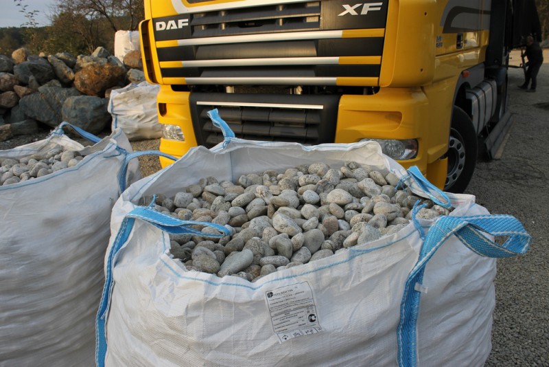 Валуны размером до 400 мм привозят в биг-бэгах. Валуны большим размером привозят навалом в фурах. В последствии их выгружают спецтехникой при использовании тн чалок.