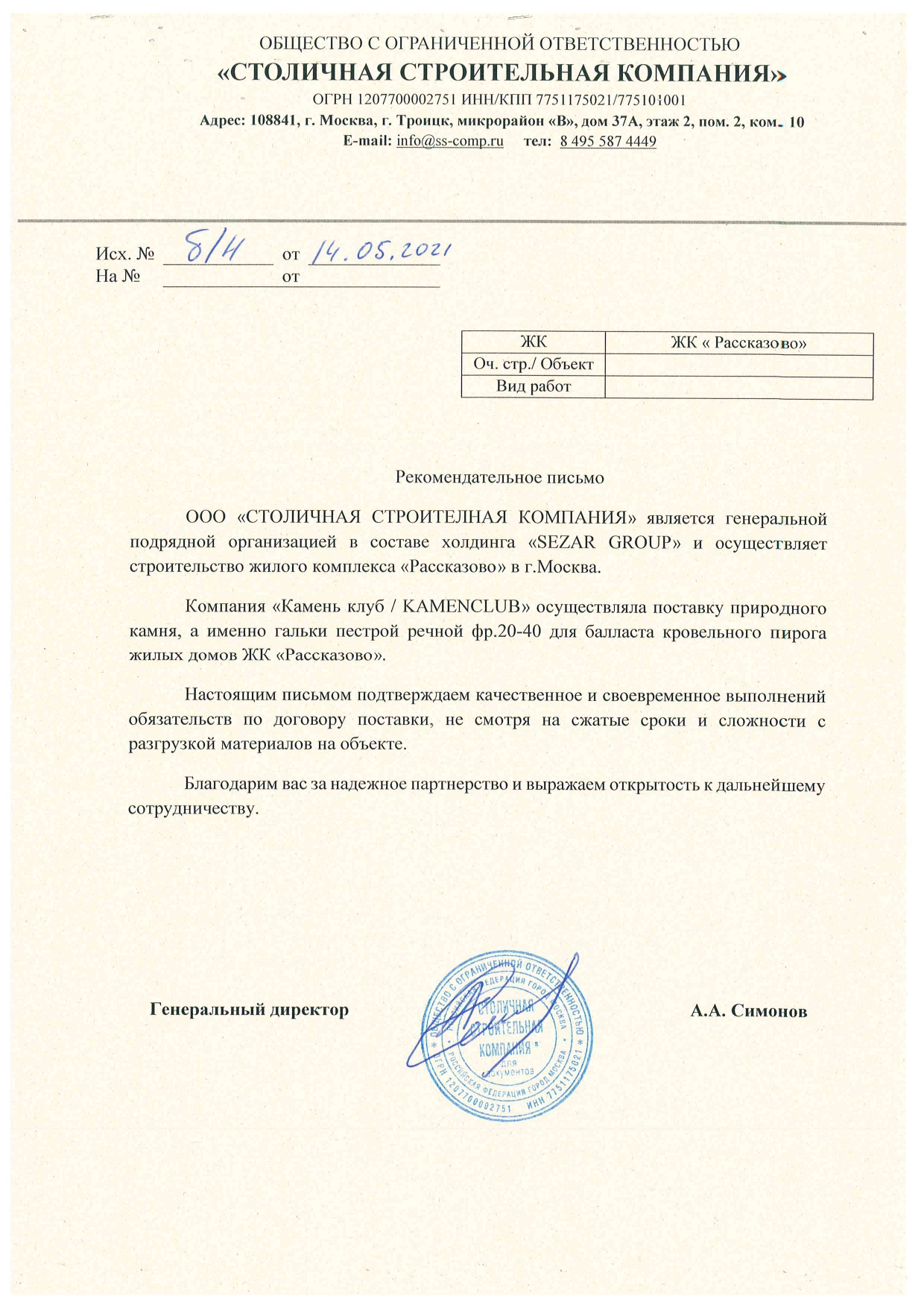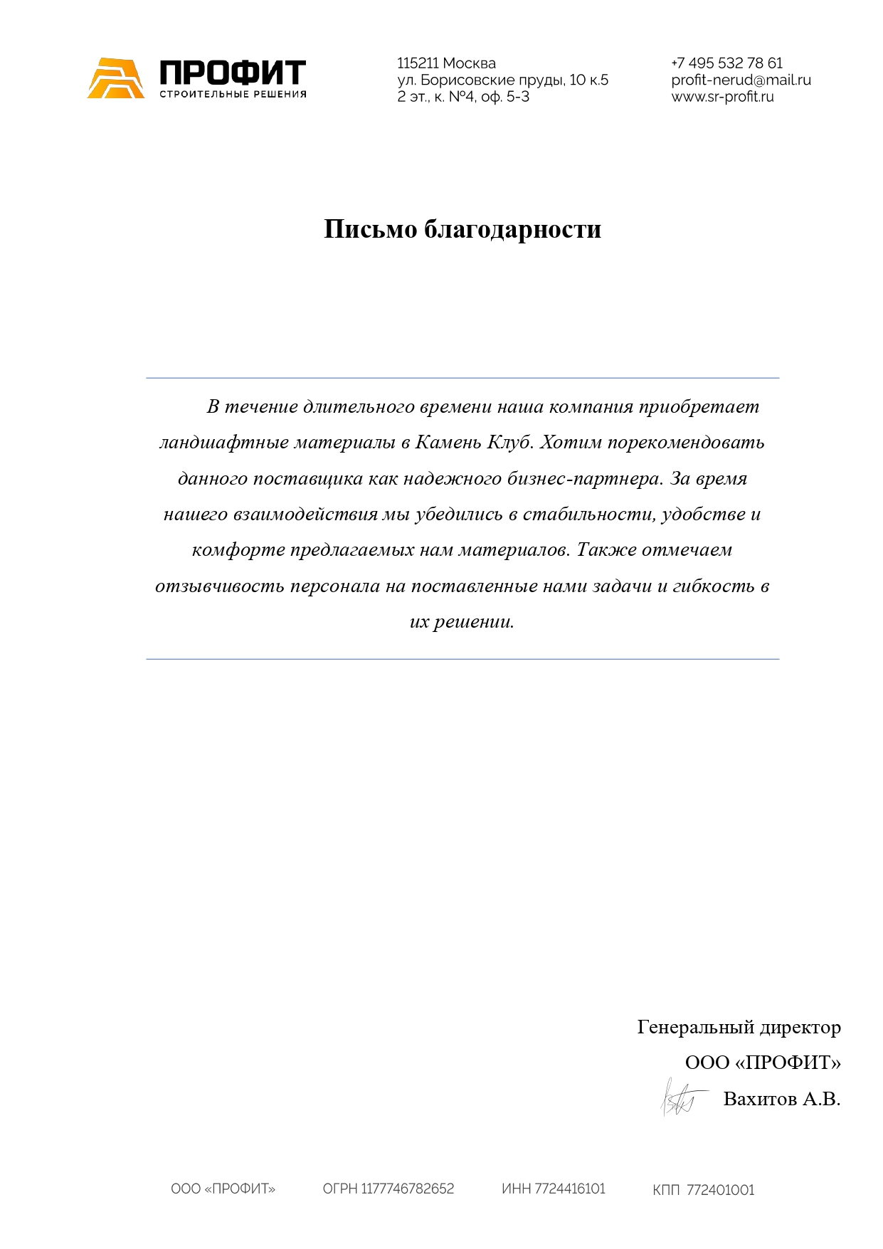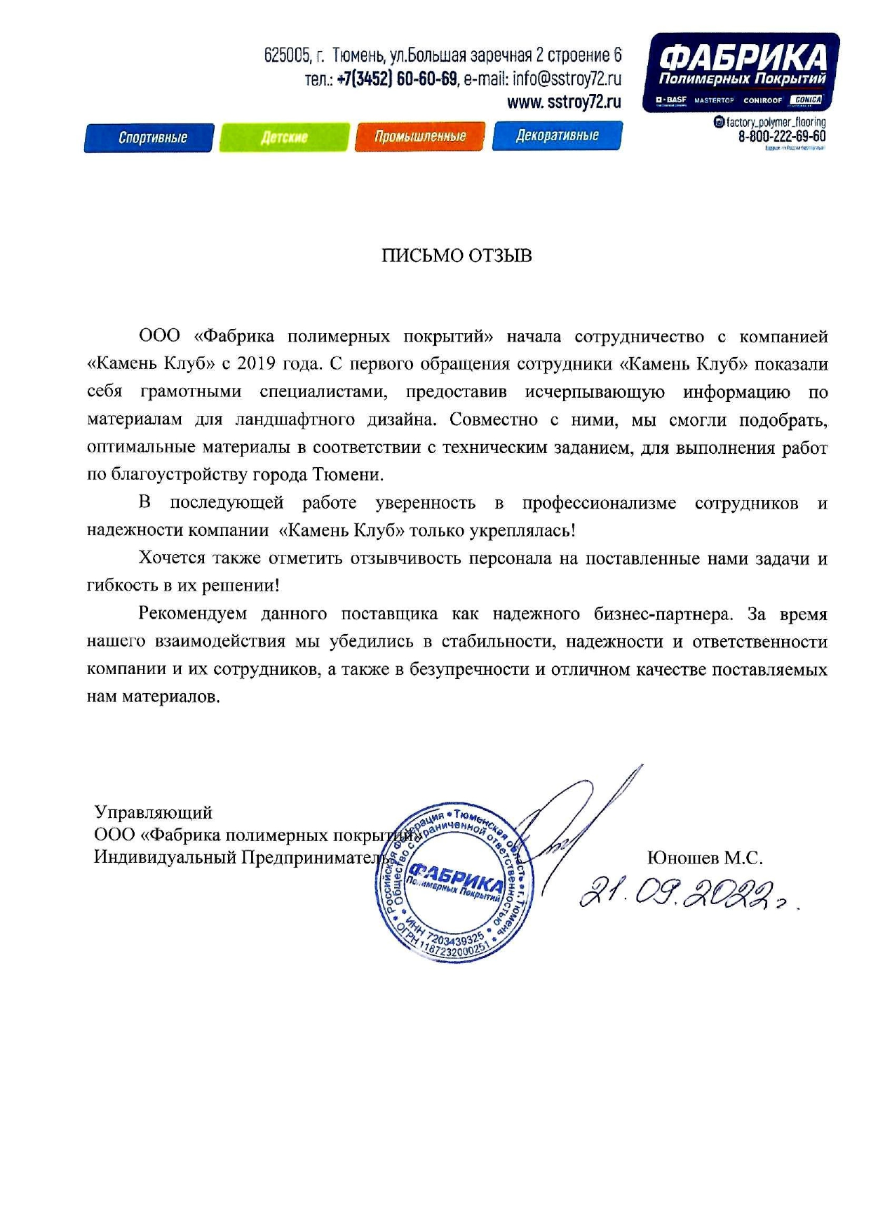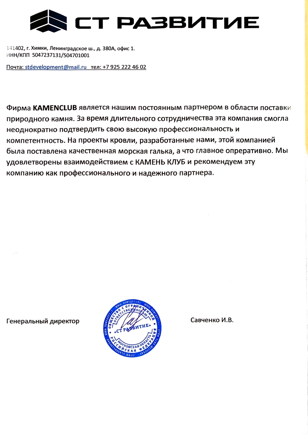 • Рекомендательные письма клиентов Камень Клуб